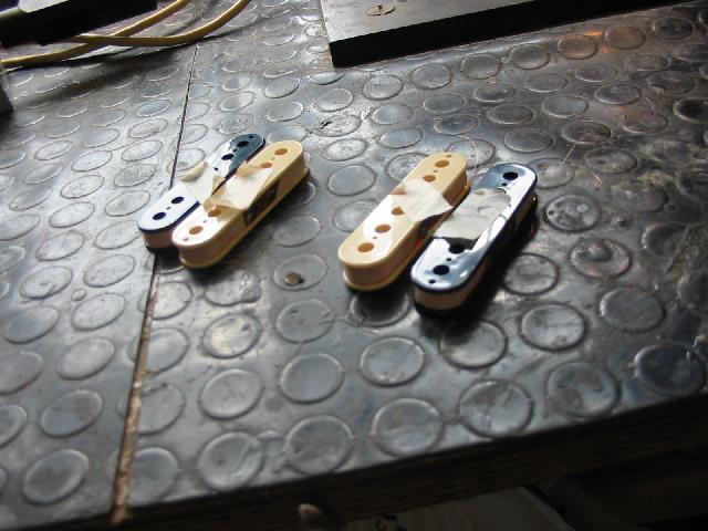 Die Spulenkörper werden zunächst zentrisch auf die Adapterplatte des Wickelmotors geschraubt. Dann wird der Draht ein paar Windungen über den Spulenkörper gelegt, das Drahtende lugt hervor und wird mit Klebeband am Spulenkörperboden fixiert. Los geht's, gasgeben! Stufenlos wird per Druck auf den Fußschalter der Wickelmotor in Gang gesetzt und beschleunigt. Ein ruhiger Fuß für die Dosierung der Geschwindigkeit und ein geschicktes Händchen zum Führen des Drahtes ergeben nach 2-3 Minuten Karussellfahrt eine fertige Spule. Ich gönne den beiden Halsspulen je 4000 Windungen (der Hals-PU soll bluesen und singen) und den Stegspulen je 5850 Windungen (da darf's ein wenig brettern und schreien). Geht eigentlich ganz fix und nix ist gerissen. Hatte ich mir schwieriger vorgestellt.