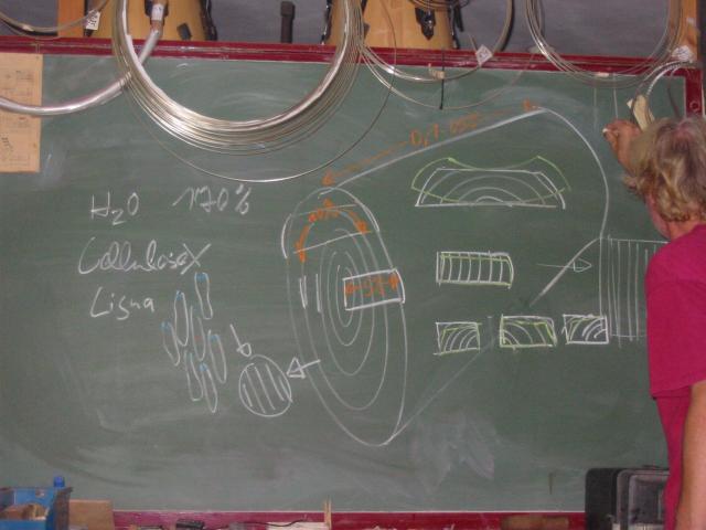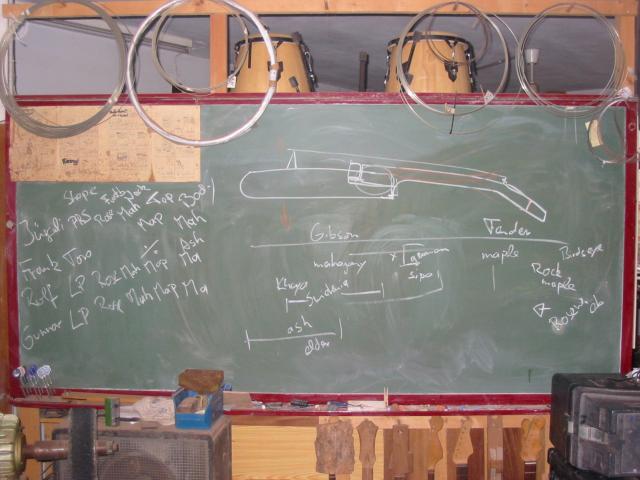 Wir alle schlendern runter zur Werkstatt und stoßen dort auf Gunnar aus Island, der ebenfalls eine Gitarre bauen möchte. Wir sind komplett. Ekki kommt, die Dinge nehmen Ihren Lauf. Frank und ich kennen das ja nun bereits: Werkstattbesichtigung. Ekki zeigt, was sich wo befindet und erklärt die Maschinen. Danach die obligatorische Unterrichtseinheit Holzkunde an der Tafel und die Einteilung der Hölzer, die mit der Frage endet, was jeder denn nun bauen möchte, eine Glasvitrine oder lieber 'ne Gitarre. Frank - sowohl Gitarrist als auch Bassplayer - baut diesmal einen Toro Bass, Jürgen will eine PRS und Gunnar und ich haben uns auf 'ne Paula eingeschossen.