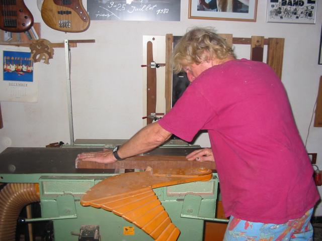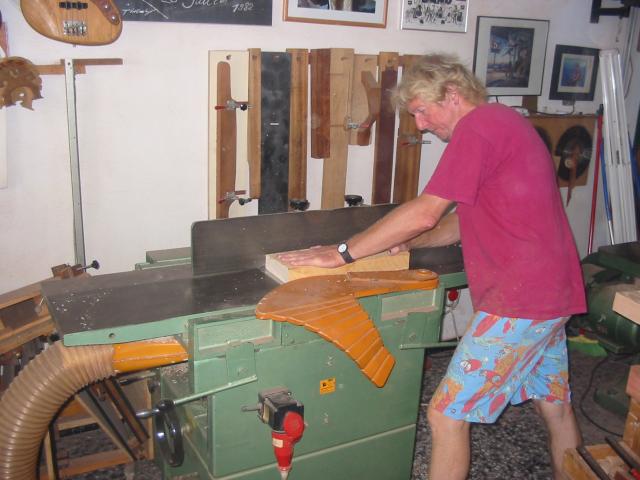 Ekki wirft den Hobel an, alle Bodies und Decken werden auf Maß plangehobelt. Danach werden die Bodies mit Weißleim und anschließend die Tops mit Titebond verleimt. Darüber ist es halb drei geworden. Wir alle machen Schluß und verabschieden uns in die Pause. Frank und Gunnar legen sich an den Fonda-Pool, Jürgen weilt im Illes Pitiüses und haut sich aufs Ohr, ich radel' runter zum Sunsplash und schmeiß' mich erst in die Wellen, dann in den Sand.