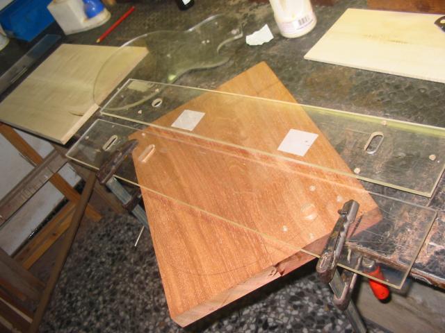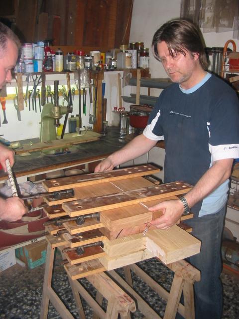 Um 18:00 Uhr geht es dann wieder weiter: Zunächst den Kabelkanal fräsen, dann werden die Bodies und Tops in der Presse miteinander verleimt. Danach gehen wir nochmals Holz für den Hals aussuchen. Auch hier hobelt Ekki die Hölzer wieder plan.