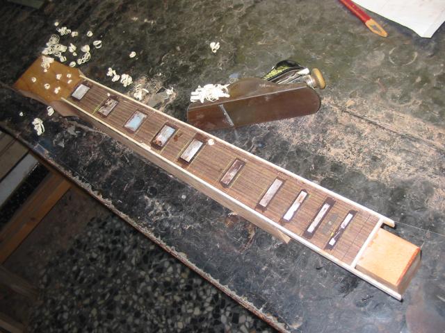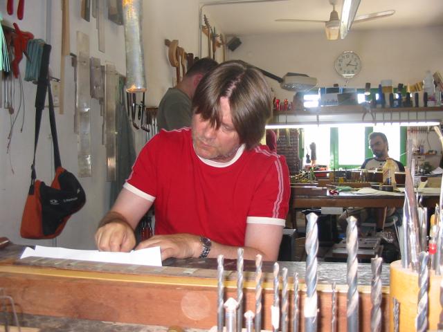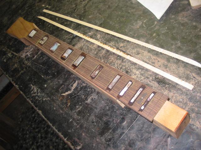 Woche 2! Ekki und Kiko kommen mit dem Motorrad. Den Vormittag verbringen Jürgen, Gunnar, Frank und ich mit dem fräsen und anschließendem einlegen der Inlays. Eine Inlay-Fräsung verferkele ich ;-o. Anschließend wird das Halsbinding gesägt, angepasst und geleimt.