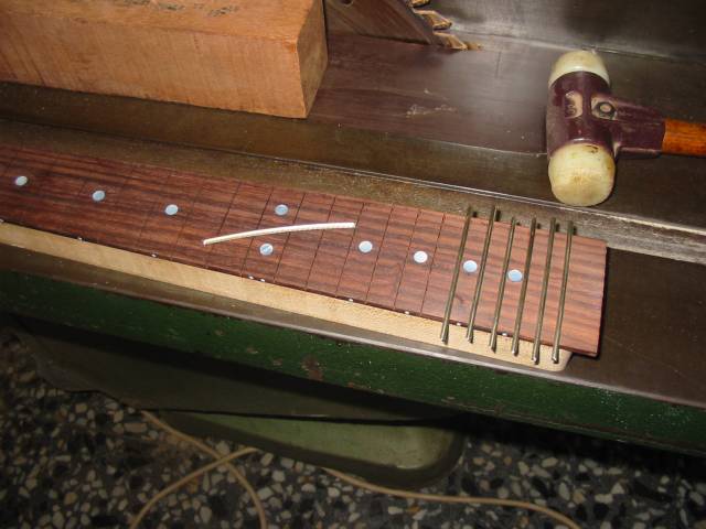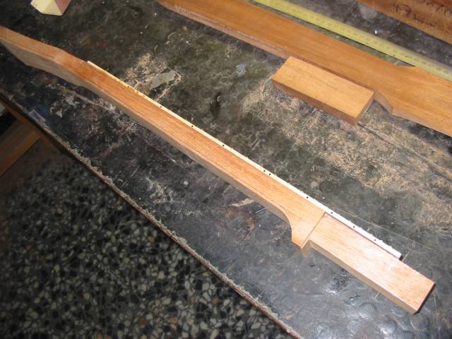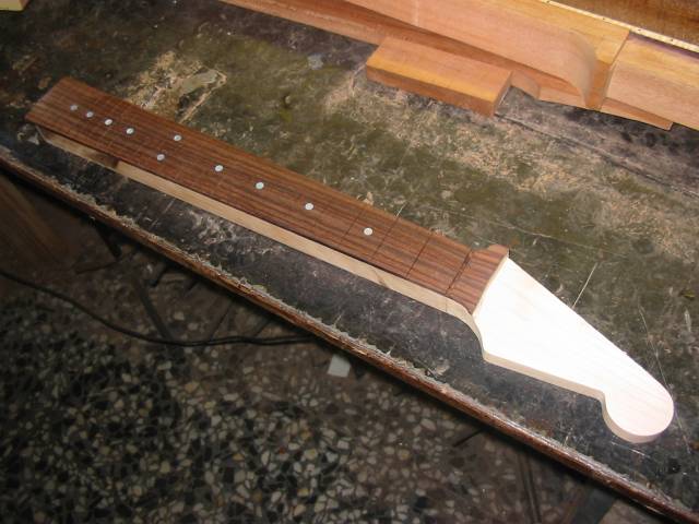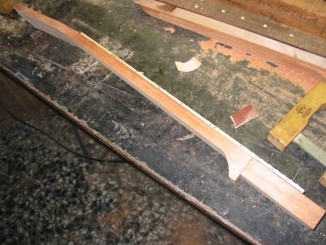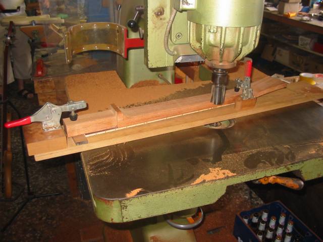 Sooo, nun ist der Hals dran. Zunächst säge ich an der gestern aufgezeichneten Kontur entlang den Halsrücken ab. Dann rauf auf die Spannvorrichtung und abfräsen auf Stärke. Fertig! Kurz nach Mittag bekommt der Strathals erst seine Dots und danach die Frets.