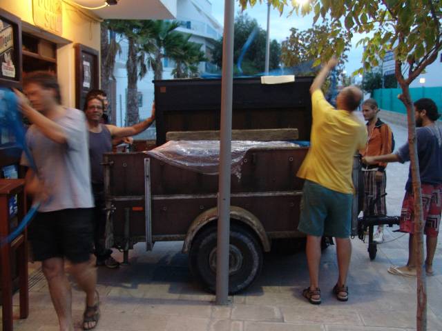 Da kommt Felix vorbei und braucht ein paar kräftige Hände, da sein Klavier angeliefert wurde. Wir alle gehen hoch zum Bon Sol und hieven das Klavier vom Hänger in die Kneipe. Anschließend geht's zurück zur Werkstatt. Dort packen wir das ganze Krawallgeraffel in Ekkis Bus, fahren hoch zur Plaza und bauen auf.