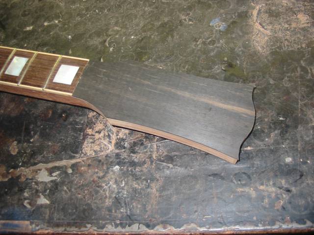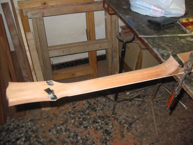 Anschließend wird der Hals/Kopf-Übergang auf das Feinste verrundet, ebenso der Abschluß zum Stöckel. Das Ganze mache ich dann nochmal am 3/4-Strathals. Jetzt sieht's so langsam nach Gitarren aus.