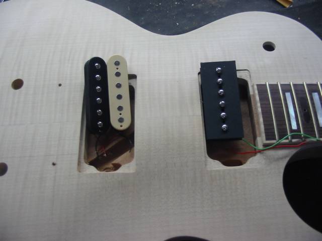 Den Vormittag verbringe ich mit dem Wickeln der Pickups. Erst der P90 für den Hals. Dafür passe ich zunächst den Standard-Spulenkörper längenmäßig an, so dass er in den Cromrahmen paßt. Dann das Ding an die Wickelmaschine geschraubt, Draht eingefädelt, 3 Windungen locker drumgeschlagen und Gas geben. Das gleiche passiert dann kurze Zeit später nochmal mit den beiden Humbuckerspulen. Nun noch fix die Ein- und Ausgangsdrähte dranlöten, Polepieces, bzw. Schrauben reindrücken und -schrauben und fertig sind die Pickups.